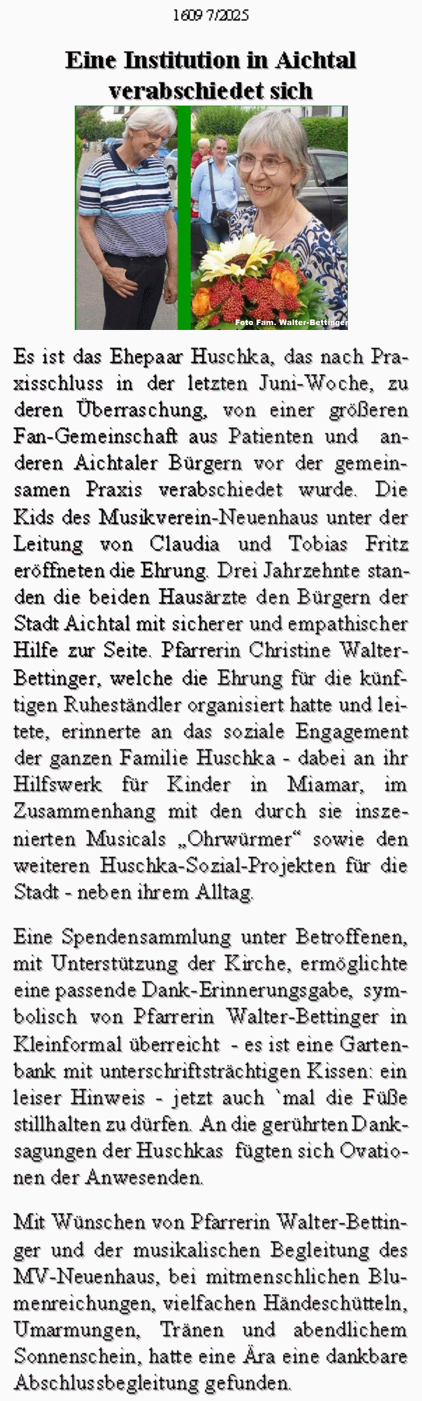 Kartenvorverkauf Schreib- und Spielwaren Etzler, * * * * * * Anständig reparieren * Wenn Integration zur Lebensaufgabe wird * Text /Amtsblatt Aichtal: Gratulieren darf man auch Martina und Bernhard Huschka. Ein Ehren-amtspreis, ausgelobt von der Kreis-sparkasse und der Nürtinger Zeitung ging an die Gründer der „Ohrwür-mer“. Mit viel Herz, unendlicher Ge-duld und freunlicher Zielstrebigkeit sind die beiden seit Jahren ehren-amtlich Initiatoren, Chorleiter, Orga-nisatoren, Ideengeber und Regisseure des Kinder- und Jugendchores. In-zwischen werden zwei Musicals, eines mit Kindern im Frühjahr und eines im Herbst mit Jugendlichen, in der Schulturnhalle in Neuenhaus aufgeführt. Alle Spenden kommen dem Straßenkinderprojekt Amare in Brasilien zu Gute. „Wir danken Dir, was Du uns gegeben hast“, war die be-wegende Danksagung der Ju-gendlichen an Bernhard Huschka, nach einer Aufführung. * * ---------------------------------------------